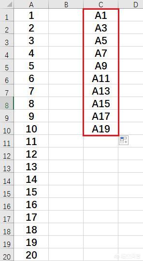 1、首先,在C1单元格输入“A1”,C2单元格输入“A3”,然后选中B1、B2,将鼠标移到选中框的右下角(此时鼠标变为“+”形),按住鼠标左键不放将框下拉至C10单元格处,松开鼠标左键,此时C1:C10单元格,如下图所示。