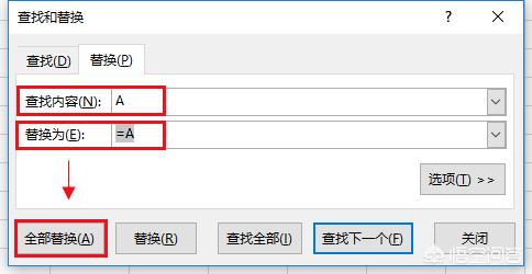 3、按快捷键“Ctrl + F”打开“查找与选择”对话框,切换到“替换”选项卡。在弹出的对话框中,查找内容中输入”A”,替换内容键入”=A”,点击”全部替换”按钮。