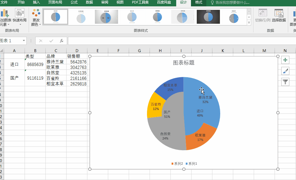 这样对应的品牌和国产进口两种类型的占比就能通过一个双层饼图表现出来了。