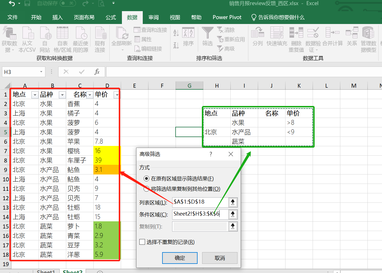 第二步:选择高级筛选,列表区域框中目标筛选区域,条件区域框中我们设置好的条件,然后确认就好了。