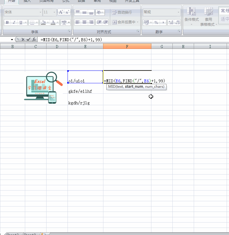 这时我们先选中需要的单元格→然后在【编辑栏】中输入函数=MID(E6,FIND(“/”,E6)+1,99) →单击【enter】,即可得出前一列单元格中特殊符号后的字符。