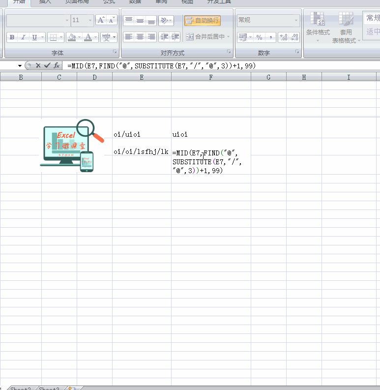 这时我们先选中需要的单元格→然后在【编辑栏】中输入函数=MID(E7,FIND(“@”,SUBSTITUTE(E7,”/”,”@”,3))+1,99) →单击【enter】,即可得出前一列单元格中第三个特殊符号后的字符。