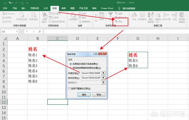只需要点击筛选,然后点击高级,列表区域设置为要提取数据的区域,条件区域设置为想要提取的数据,然后直接点击确定,这样的话,就会在数据源中提取到姓名3和姓名6。
