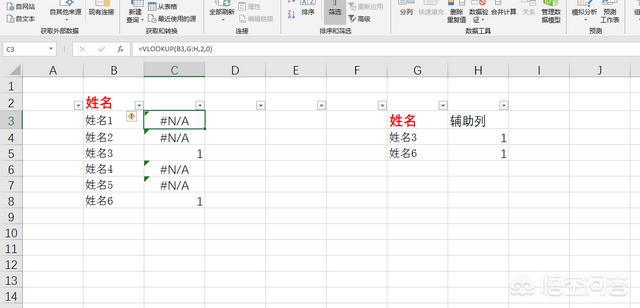 使用vlookup函数我们需要添加一个辅助列,比如在这将辅助列都设置为1,然后使用vlookup函数进行数据匹配,匹配完成后,使用筛选,筛选结果为1的数据,这样的话也能提取到,姓名3和姓名6。