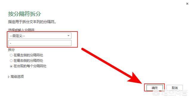 ①导入编辑器后,选中【号段】字段,点击【开始】→【转换】→【拆分项】选项,选择【按分隔符】选项。接下来会弹出【按分隔符拆分列】对话框,设置分隔符为【自定义】,并输入【-】号,如图所示。