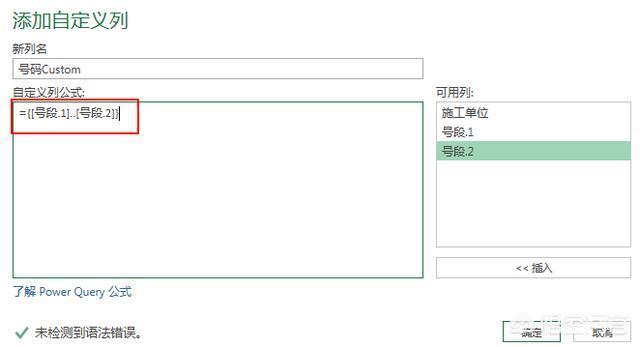 ②在弹出的【添加自定义列】对话框中,设置新列名为【号码】,自定义列公式为={[号段.1]..[号段.2]},这样数据表就添加了一个新的数据列。