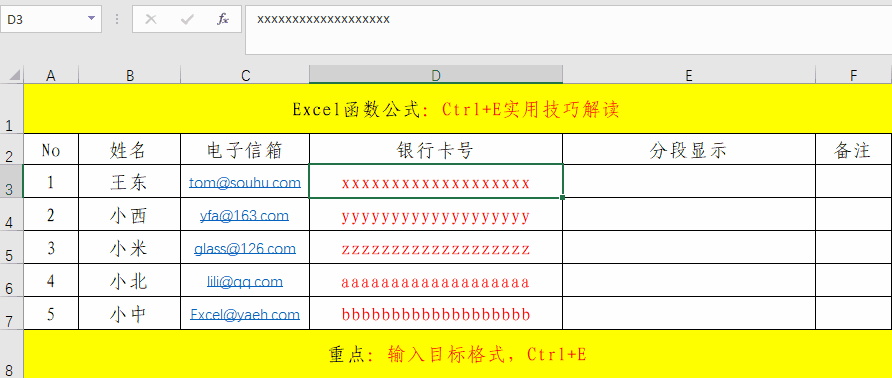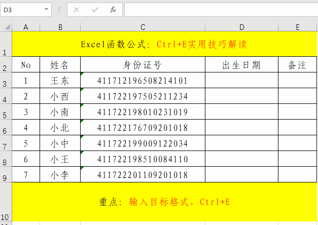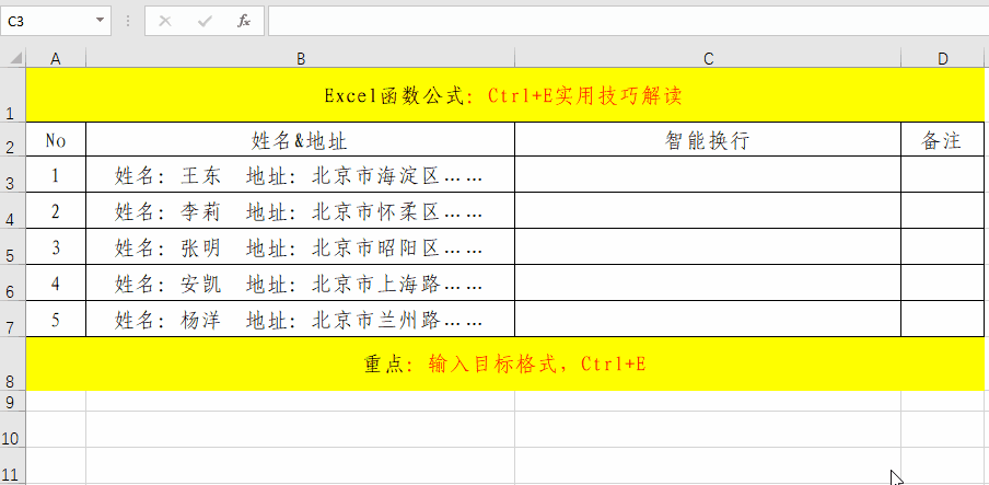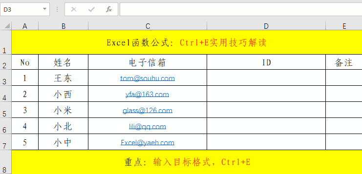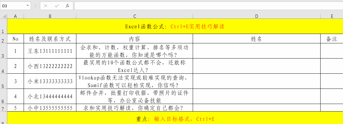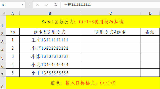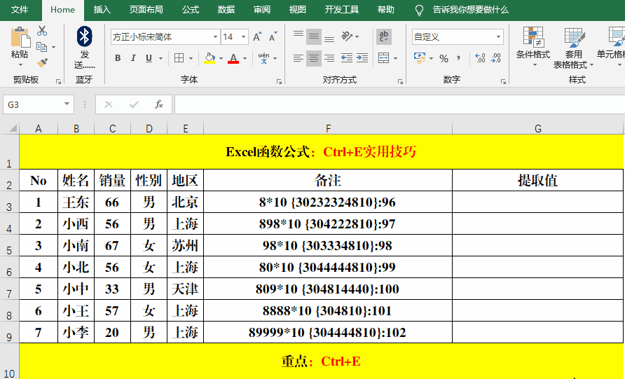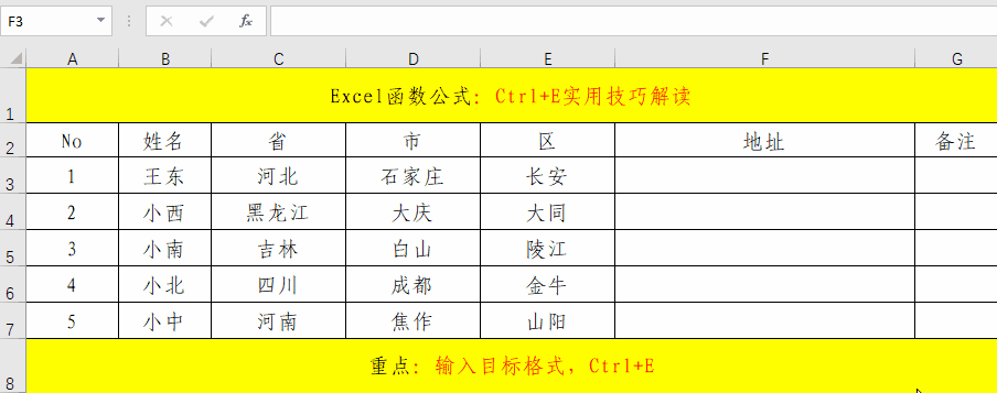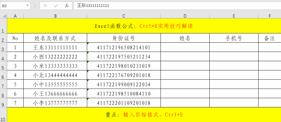 实际工作中,相同格式的批量数据处理也是非常的多的,如果一个一个去处理,将会非常的麻烦,如果我们掌握了Ctrl+E快捷键,将会对我们的工作效率有很大的提高。其主要操作就分为三步。1、录入格式;2、选定区域;3、快捷键Ctrl+E。