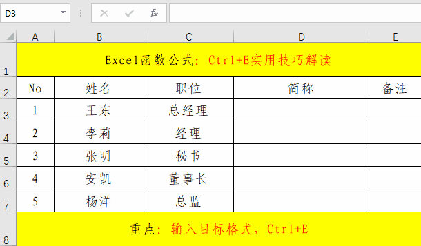 在实际的工作中,设置格式的地方非常的繁多,如果是大批量的,费时费力,比较麻烦,如果有一个类似于“格式刷”的快捷操作,我们只需“刷、刷、刷”应该是个不错的事情。其实,Excel早就替我们想到了此需求,只不过不是“刷、刷、刷”,而是“按、按、按”,此快捷键就是Ctrl+E。
