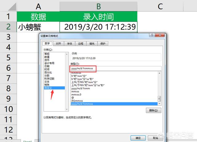 (3)选择B2单元格设置自定义格式为:yyyy/m/d h:mm:ss,然后向下填充公式。