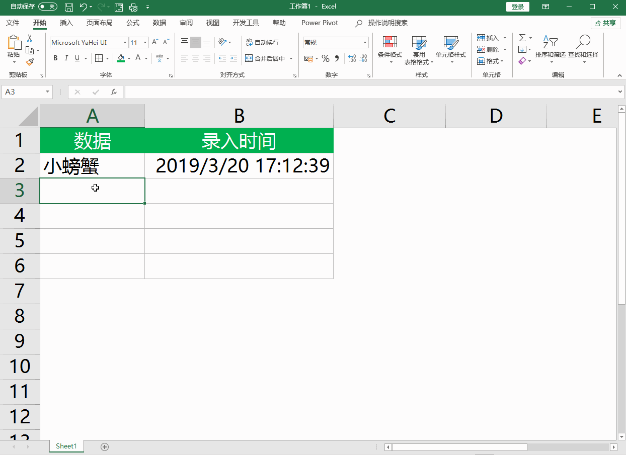 如下效果图,需要在A列录入数据,然后B列显示录入数据的时间。