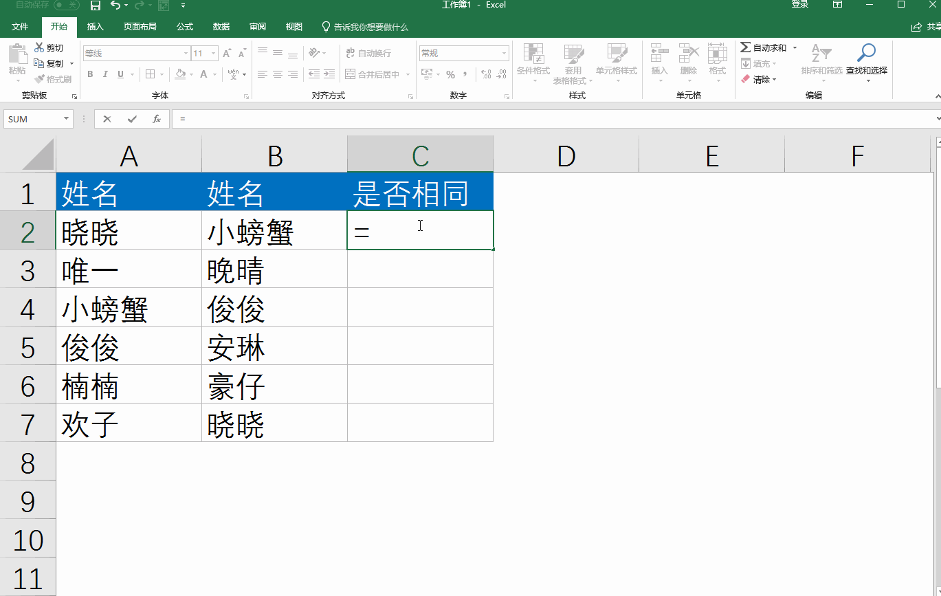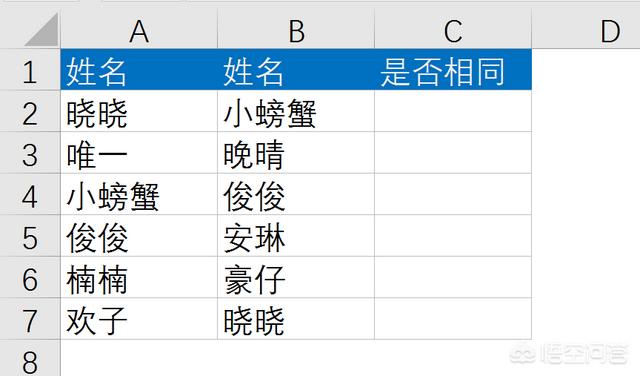 在excel两列中快速找出相同的数据,日常办公过程中,excel数据表中可能会存在一些重复的数据,有时需要将这些重复数据找出来,怎么操作呢? 如下图,在C列中统计A和B两列数据是否相同。