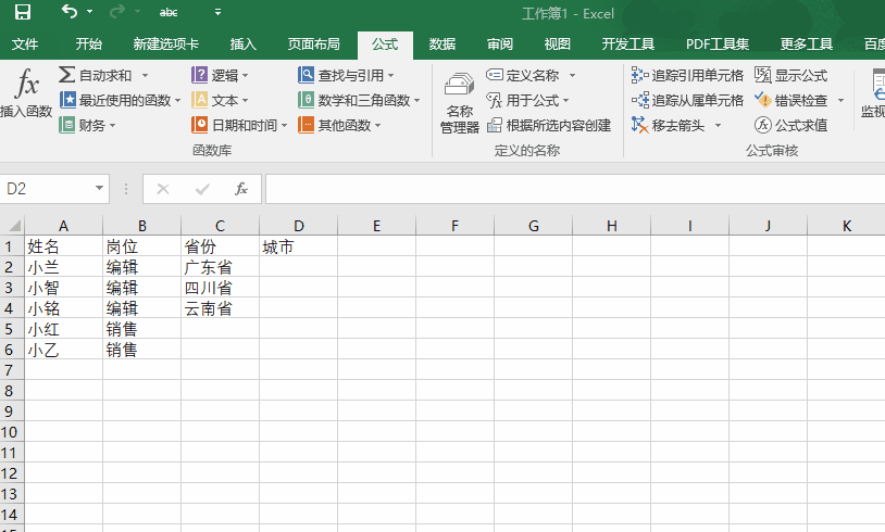1)选中省市数据区域,单击【公式】选项卡-【根据所选内容创建】-弹出窗口只勾选“首行”,单击确定。