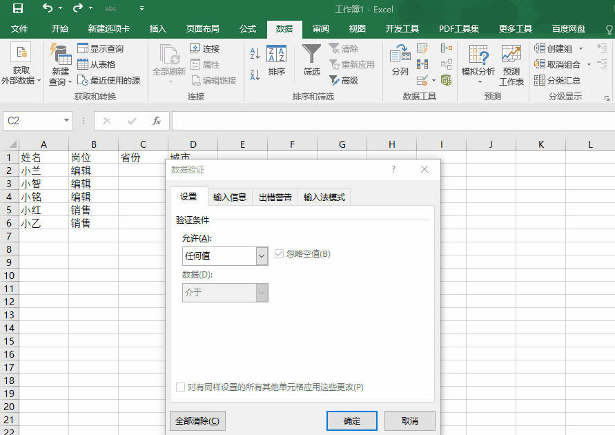 3)验证条件选择【序列】,在“来源”处输入公式“=indirect(C2)”。