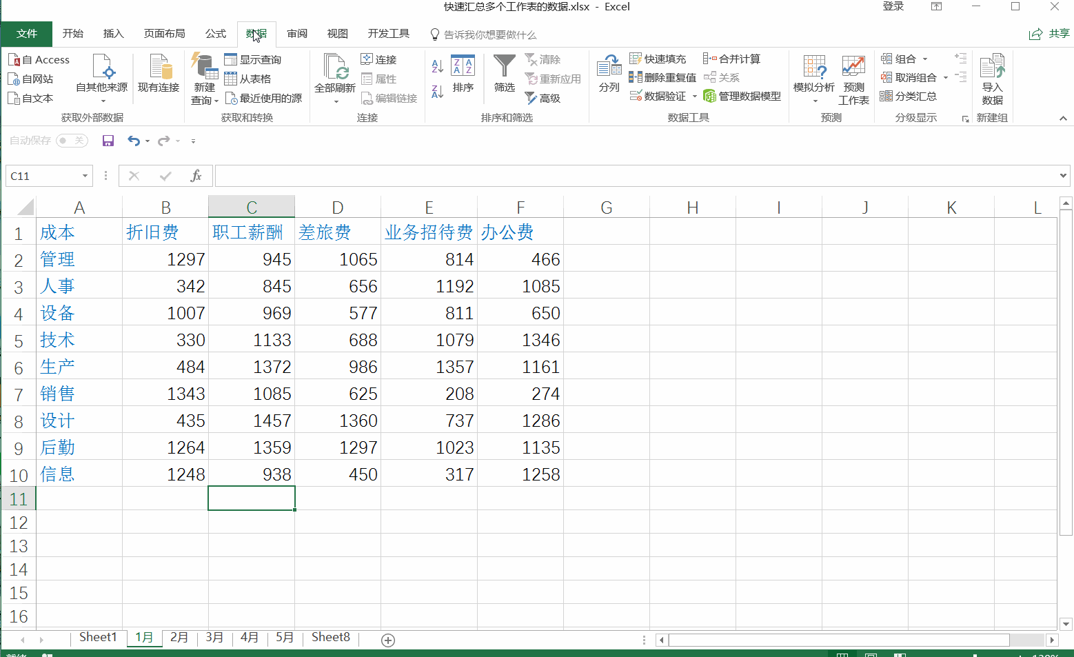 如在下图中所示的情况,我们需要将1月-5月份共5个工作表的数据进行合并,合并成一个新的工作表。请看具体操作。