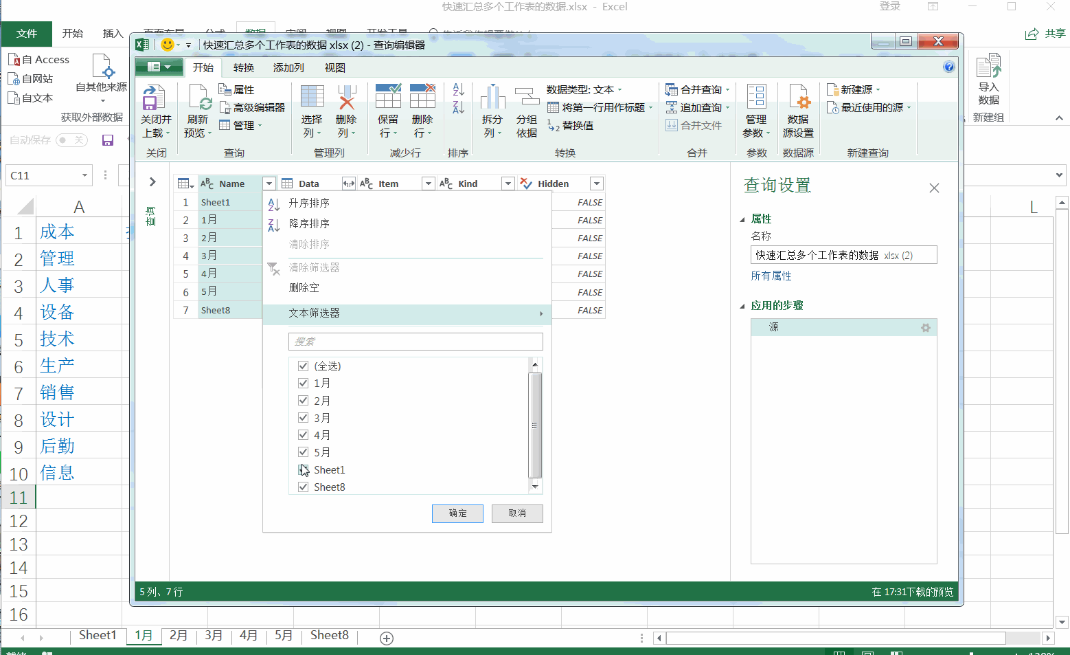 这时候进入查询编辑器对话框,因为我们是对1-5月的数据进行合并,所以需要筛选Name列,把不需要合并的工作表取消勾选,然后点击Date扩展,然后我们看到数据已经合并了。