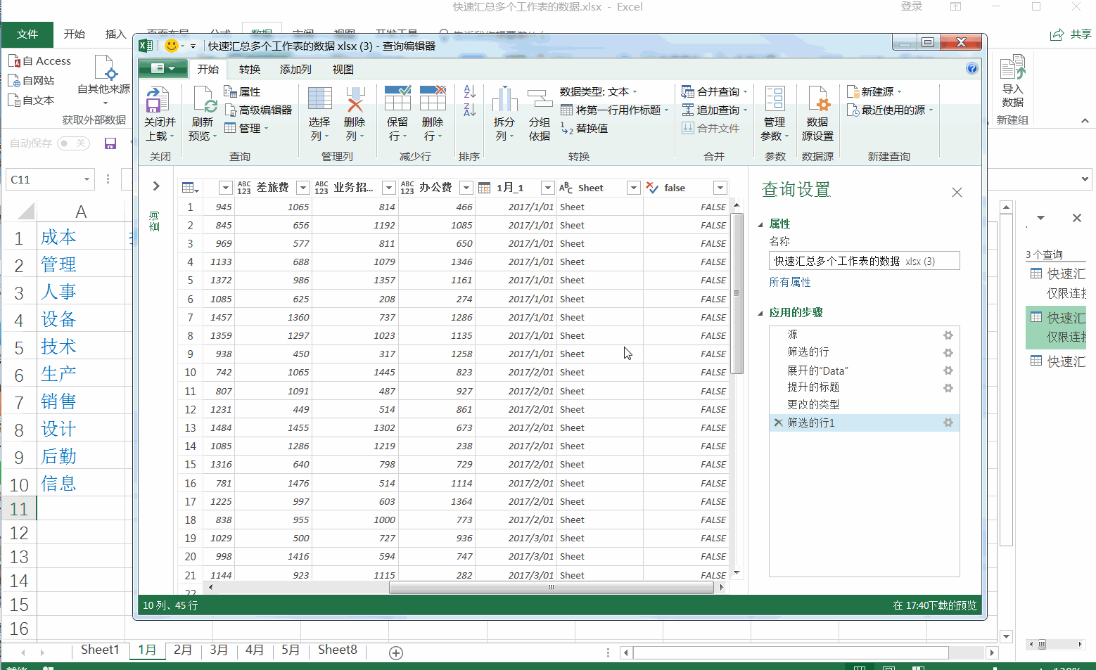 但是因为每个工作表都有一行标题,所以标题也被合并进去了,这时候选择开始选项卡下的“将第一行用作标题” ,然后筛选成本这一列,将“成本”取消勾选
