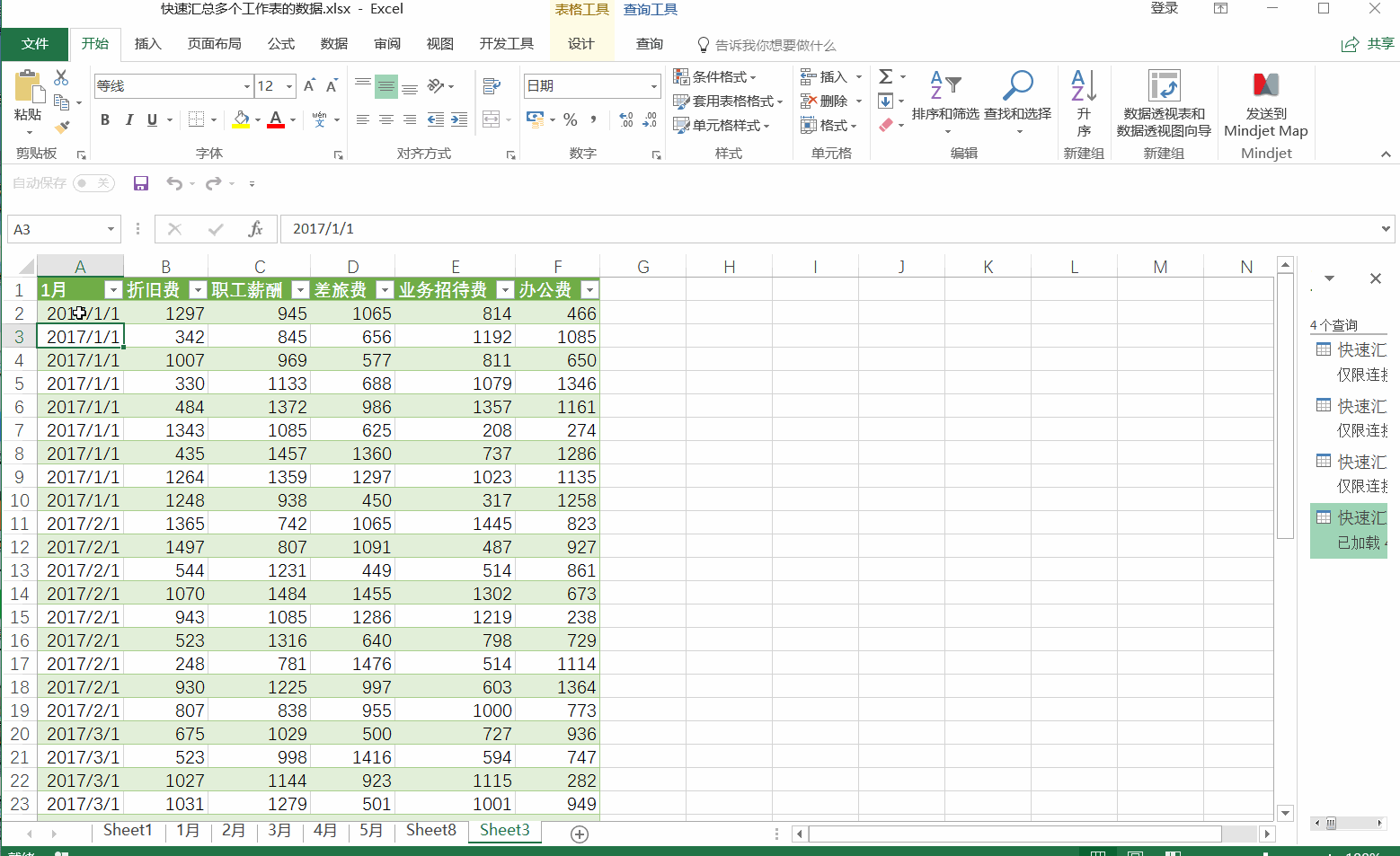 数据合并之后可以看到工作表名称是日期显示,可以对它设置自定义格式为“M月”,还有工作表是表格形式的,我们也可以将它转换为区域