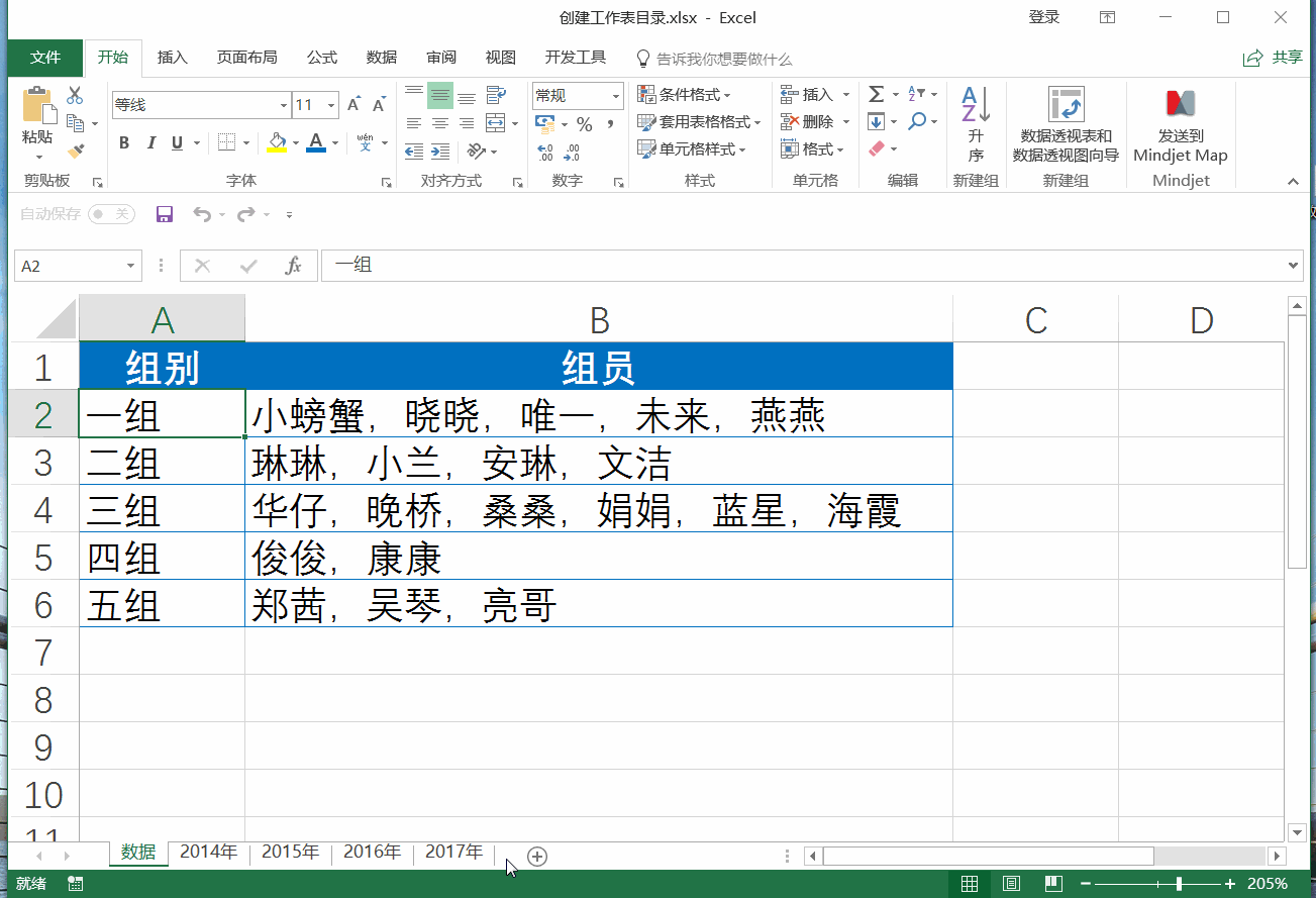 例如下图是一个excel工作簿,里面有5个工作表,需要创建一个工作表目录,在目录里点击对应的工作表名称就能快速跳转到对应工作表中。