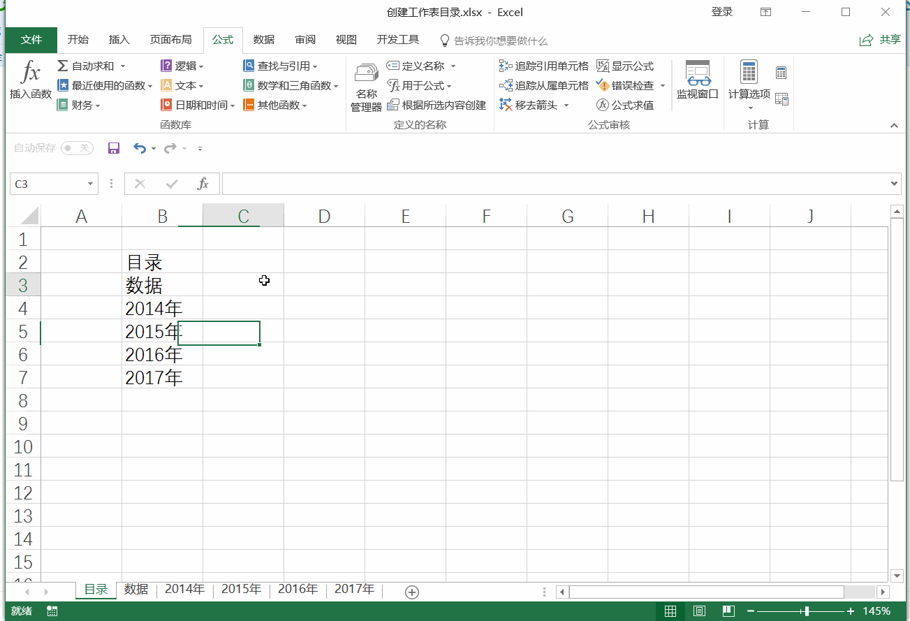 公式输入完成后,可以看到C3出现蓝色的数据,点击即可跳转到对应的工作表中。带有超链接的工作目录已创建完毕。