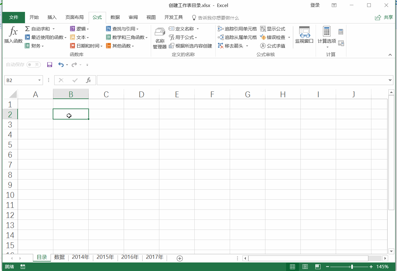(1)首先新建一个叫做“目录”的工作表,选择公式选项卡-点击定义名称,弹出新建名称对话框中名称设置为“工作表”,引用位置中输入公式:=GET.WORKBOOK(1)