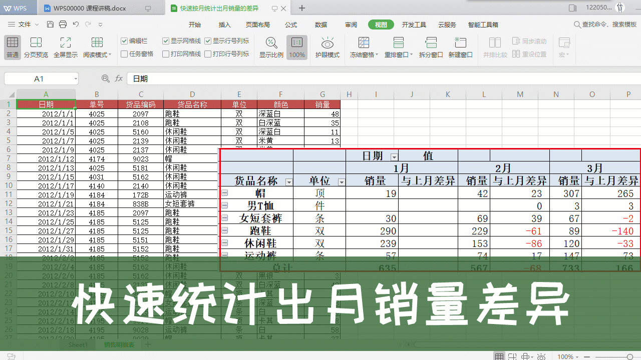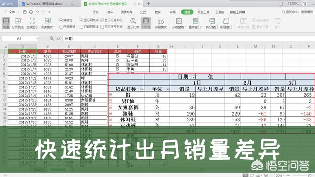 这里,举一个常用案例,源表是某服装店的销售明细表,通过使用透视表,就能轻松分析出月销量的差异情况: