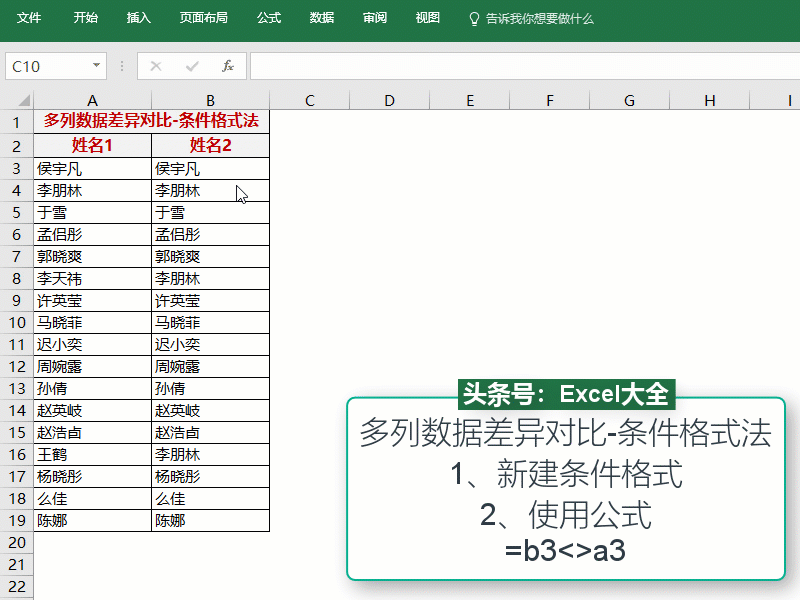 步骤:选择差异对比的区域 -> 新建条件格式 -> 使用公式 -> 输入公式 =b3<>a3