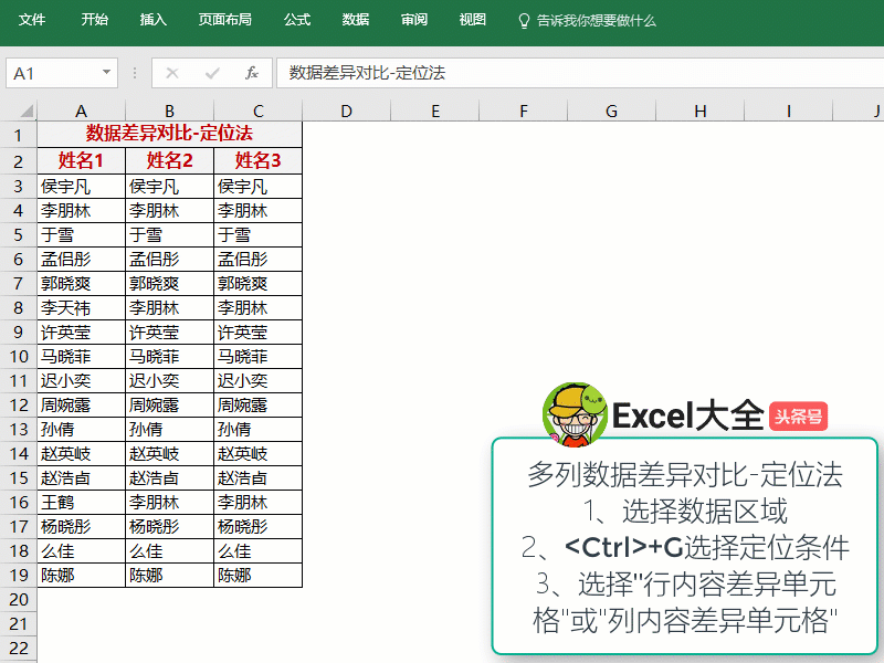 步骤如下: 选择需要查找差异的区域 -> <Ctrl>+G选择定位条件 -> 选择“内容差异单元格”