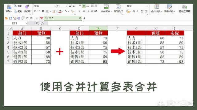 如下案例,有两张表,一张是部门预算表,一张是部门的实际费用统计,通过合并计算,就能分析出部门实际费用与预算之间的差异情况;