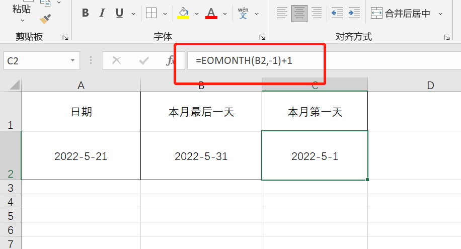 A2表示今天的日期,-1表示之前一个月,即上月,EOMONTH函数就可以返回上月最后一天的日期,我们再在这个基础上面+1,就是上月最后一天加一天,即为本月第一天。