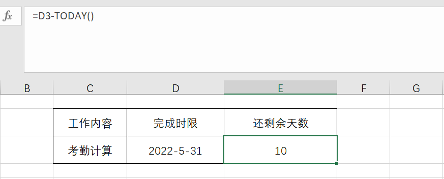 如上图,在D3单元格输入工作需完成的日期,E3单元格输入公式=D3-TODAY(),两个日期相减,就可以得到距离该项工作还剩余多少天。