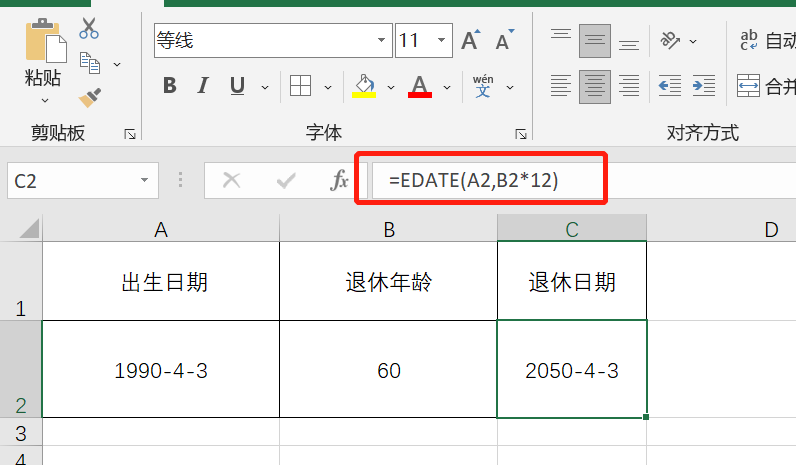如下图,A2表示出生日期,B2*12表示退休年龄乘以12个月,即出生多少月可以退休,函数EDATE就可以得到退休的日期。