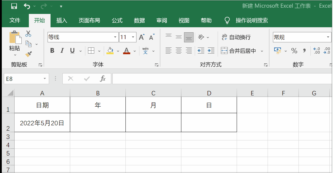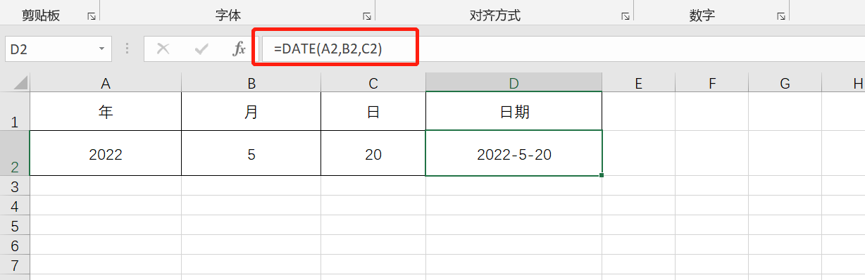 如下图所示,A2单元格的日期是2022年5月20日,我们如果需要提取该日期的年份、月份、日,就可以用以上三个函数。