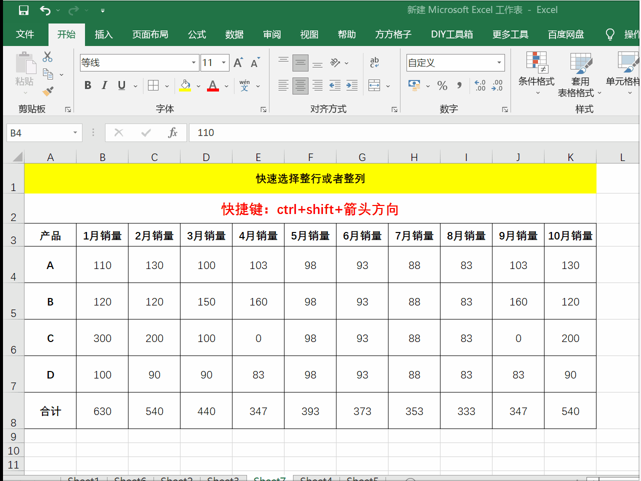 8、快速选择整行或者整列:ctrl+shift+箭头方向(快速选择整行或者整列)