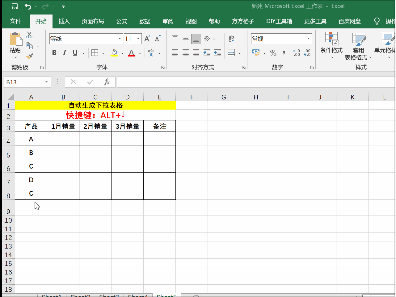 4、根据前面已经输入的内容自动生成下拉列表:ALT+↓:(注意:不能隔行)