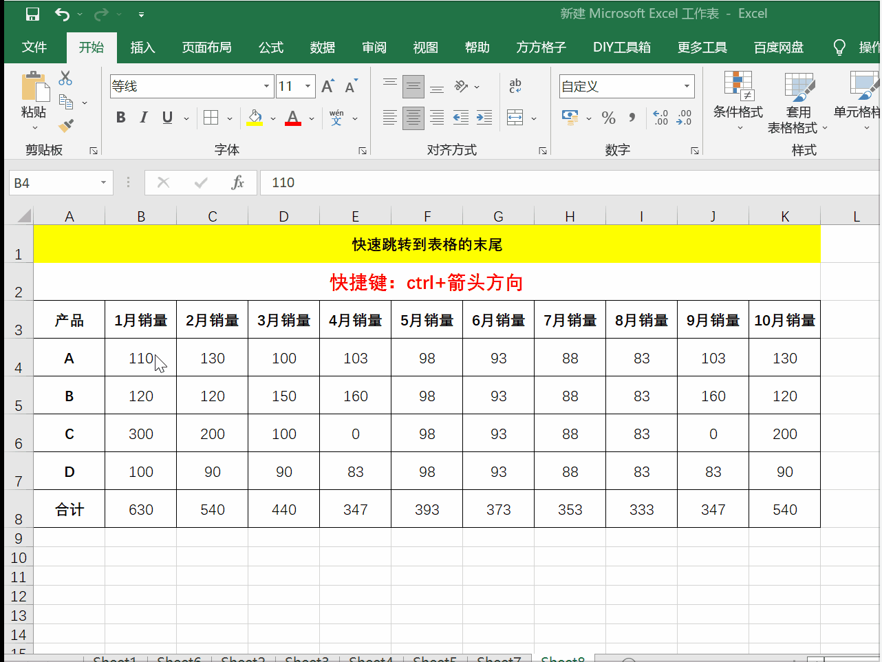 9、快速跳转到表格的末尾:Ctrl+箭头方向