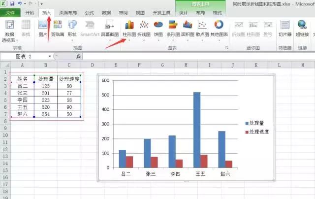 第一步:选择数据区域,点击插入—柱形图;