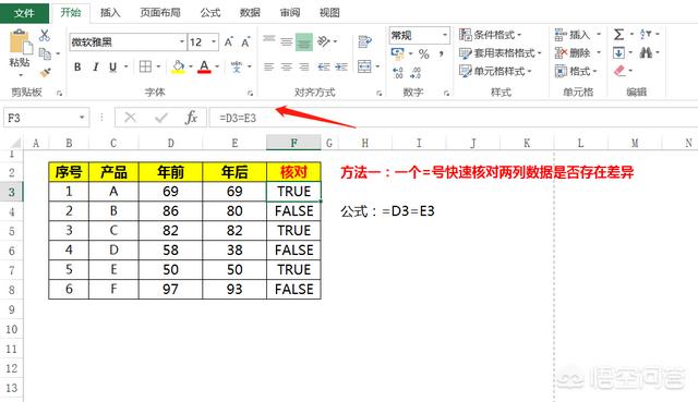 说明:在这种两列数据位置相同的情况下,我们直接用=等号来进行判断就可以核对到,如果数量不相同的会显示为False,相同的会显示为True。