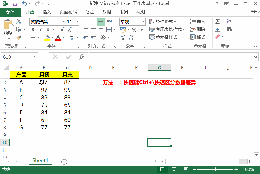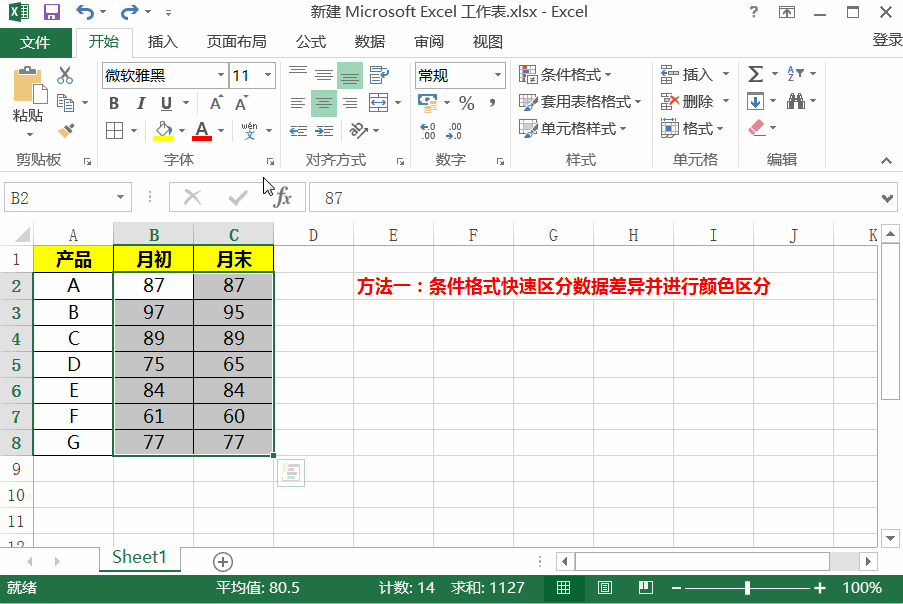 案例说明:如上图我们需要核对产品月初和月末的数量差异。这里利用条件格式就可以设置。