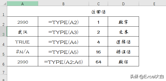 TYPE函数可以返回其参数的数值类型,它的返回值如上图所示,不同的返回值代表不同的数值类型。