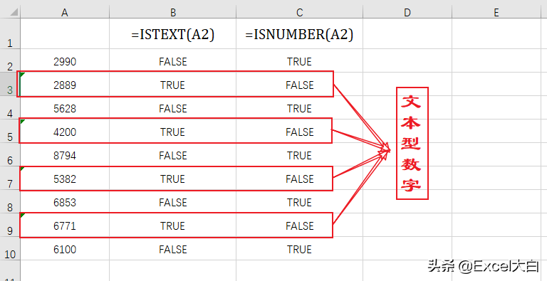 ISTEXT函数:判断数据是否为文本型数据。如上图所示,当单元格里的数据为文本型时,返回的值为TRUE,反之则为FALSE。
