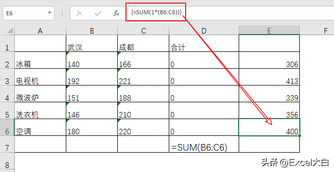 用公式:{=SUM(1*(B6:C6))} 计算就可以得到正确的结果,这个公式中我们通过”1*”文本型数字的方式将文本型数字转换为数值类型的数字。