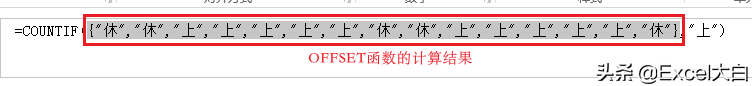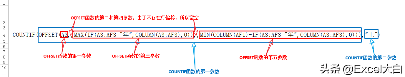 蓝色的部分则是COUNTIF函数的参数,而OFFSET函数的返回值就是COUNTIF函数的第一参数。