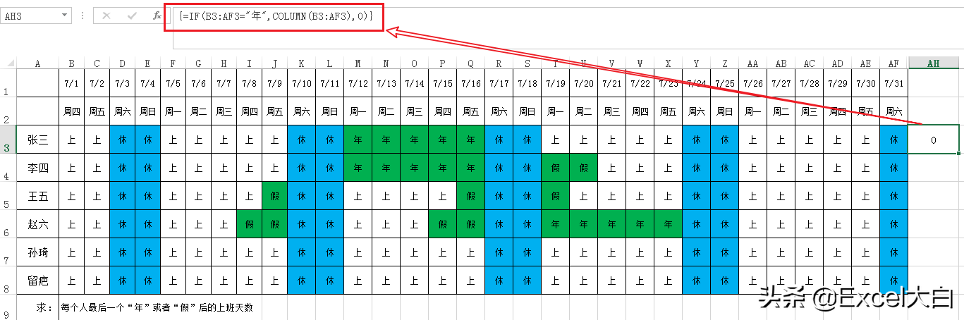 =COUNTIF(OFFSET(A3,,MAX(IF(A3:AF3="年",COLUMN(A3:AF3),0),IF(A3:AF3="假",COLUMN(A3:AF3),0)),,MIN(COLUMN(AF1)-IF(A3:AF3="年",COLUMN(A3:AF3),0),COLUMN(AF1)-IF(A3:AF3="假",COLUMN(A3:AF3),0))),"上")