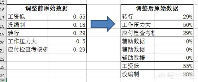 步骤7:调整原始数据因为雷达图默认为第一个数据从12点钟(0度)方向开始,然后顺时针顺延,而案例中第一个数据从270度开始,第二个数据是315度,第三个数据是0度,最后一个数据到90度,构成一个半圆,因此,调整原始数据并增加辅助数据。