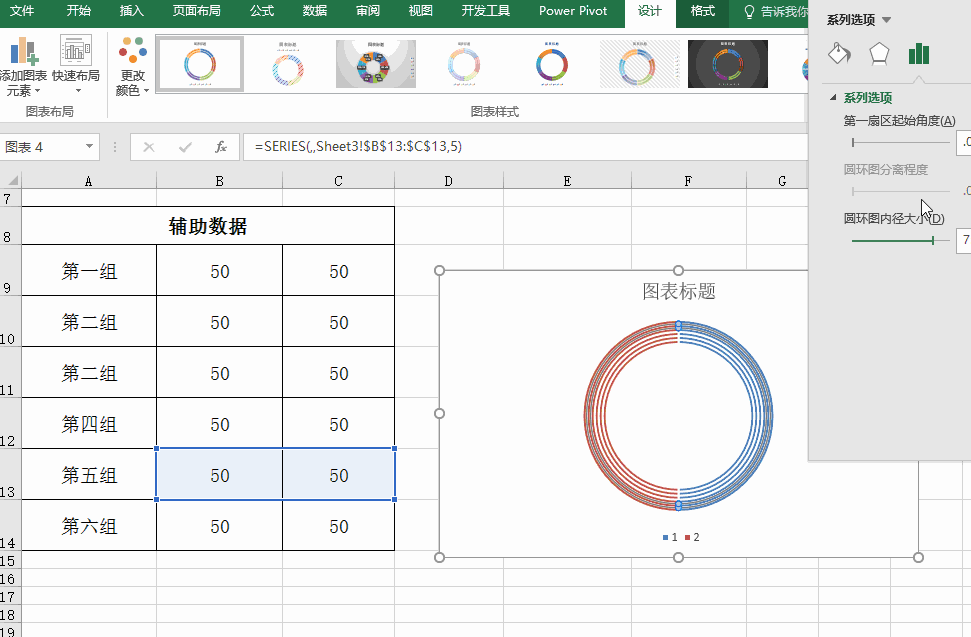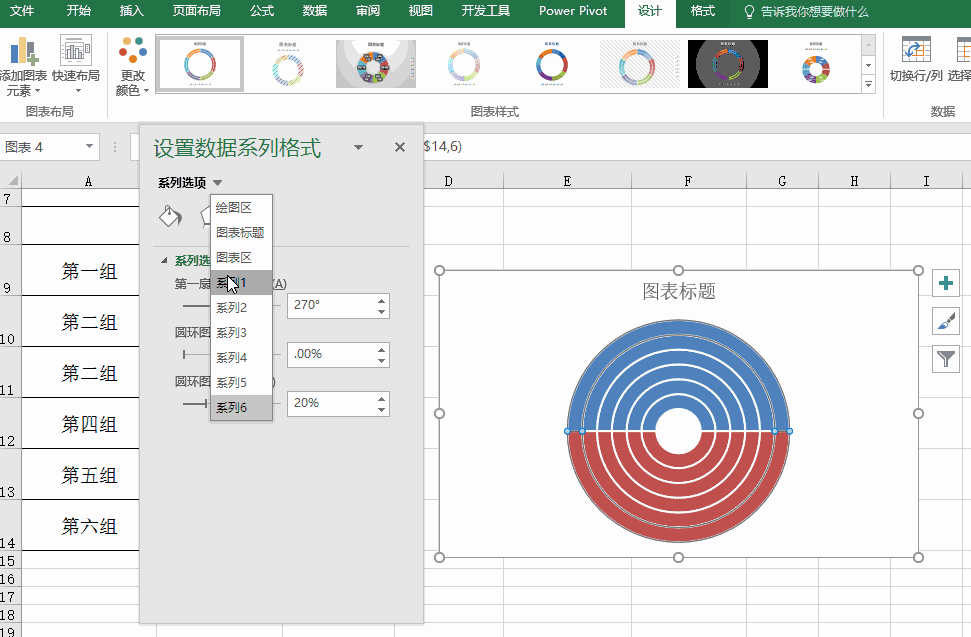 步骤4:设置系列格式将“第一扇区起始角度”设置为270度,圆环内径大小设置为20%。