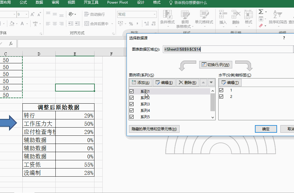 步骤2:编制辅助数据离职原因占比最高的为55%,所以圆环共有6层,需编制6组辅助数据。