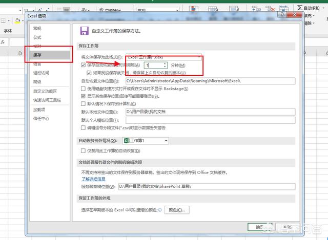 这样的话我们就进入了excel的选项设置阶段,点击保存,将保存回复的时间间隔设置为1分钟,这样的话每隔1分钟就会自动保存一份数据。