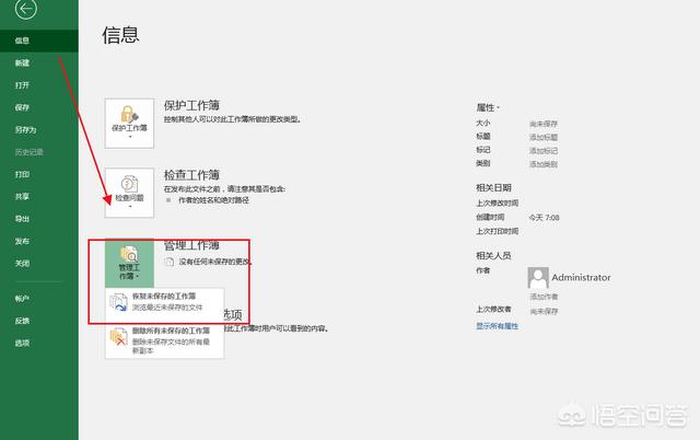 然后点击文件,然后点击信息选择管路工作簿,选择恢复未保存的工作簿。