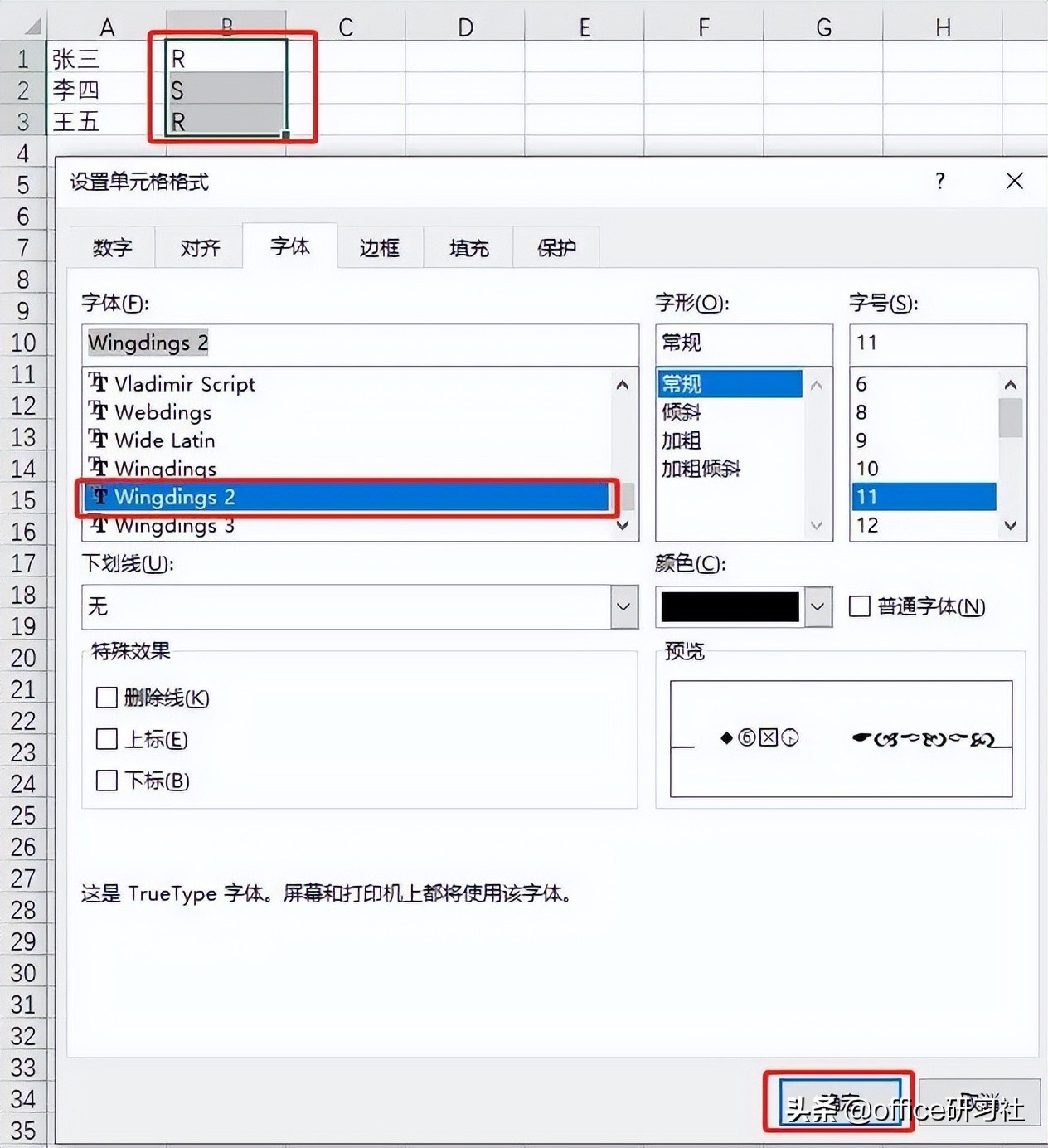 在表格中录入R和S,(R为勾S为叉),然后选中数据,打开“设置单元格格式”,选择字体——Wingdings2——确定,即可完成。