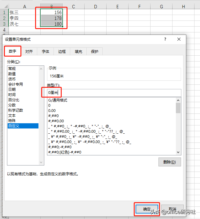 比如添加身高单位,只需选中身高数据,打开“设置单元格格式”,选择数字——自定义——类型输入0厘米——确定,即可完成。
